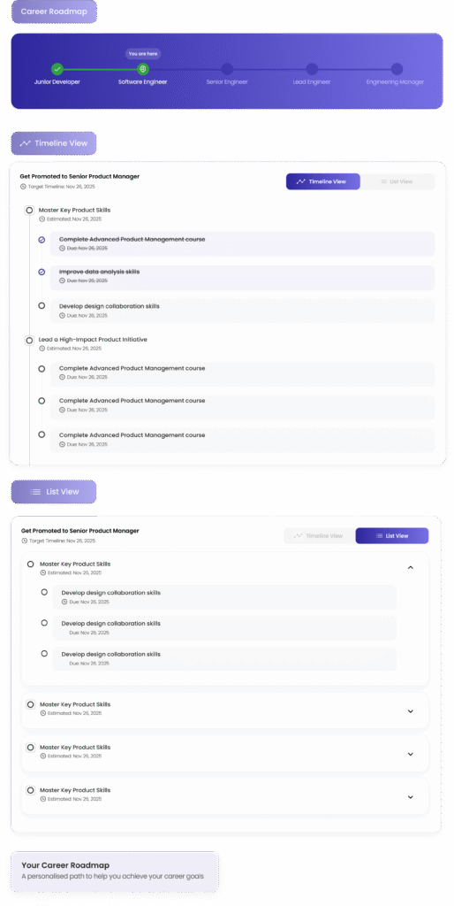 Just as GPS navigation provides turn-by-turn directions while adapting to traffic conditions, our Career Roadmap Management system guides you through each strategic career move while adjusting for market changes, new opportunities, and your evolving goals.